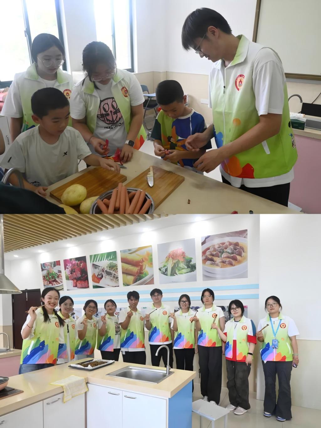 在教学之余,实践团员也加入到烹饪课的行列中。在烹饪室里,队员们与孩子们一起在授课老师的带领下切葱花、削土豆皮、烤出一份份孜然土豆火腿肠。食物的香气在空气中弥漫,大家不仅感受到亲手做饭的成就感,还学会了一门技能。成员们与孩子们其乐融融,欢声笑语与饭菜的香味碰撞出快乐的火花。