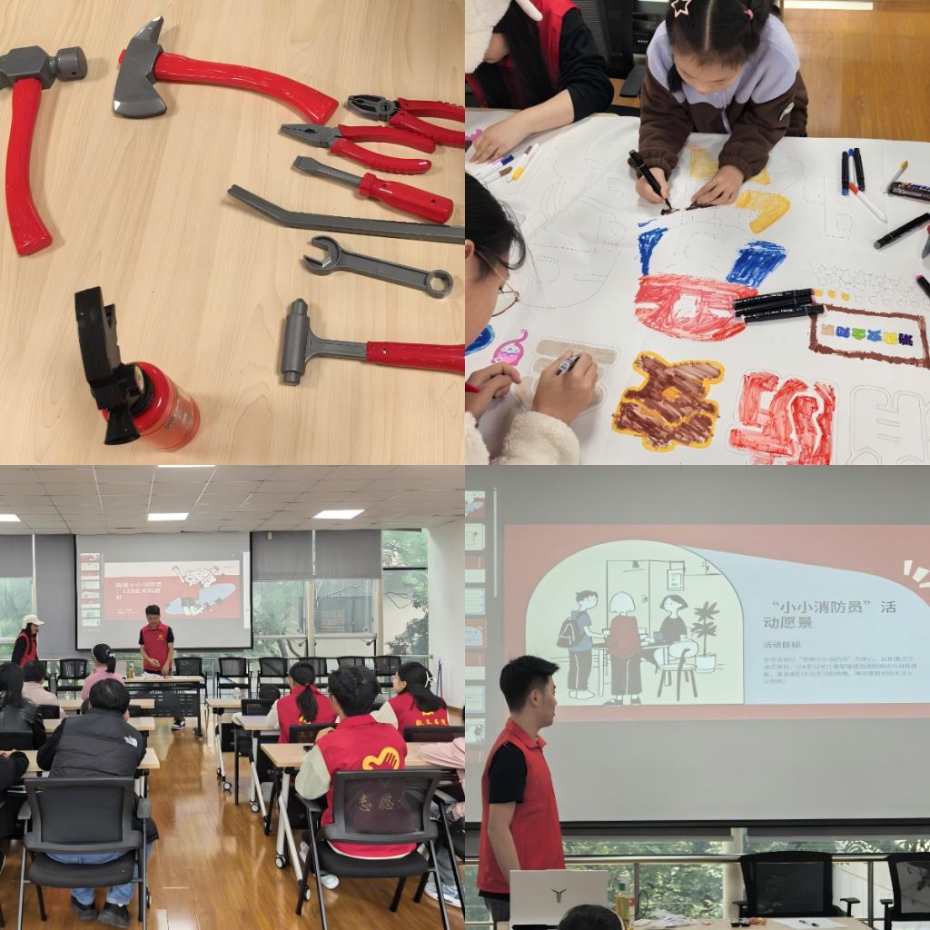 此外,志愿者们向社区小朋友们介绍了十种常见的消防与应急工具:尖嘴钳、钳子、消防锤、十字螺丝刀、一字螺丝刀、镐子、铁锤、扳手、斧头以及灭火器。用浅显易懂的语言解释每种工具的用途,让孩子们在好奇与互动中认识这些"安全守护者"。同时,还准备了这些工具的模型,交给小参与者们仔细观察与辨别。