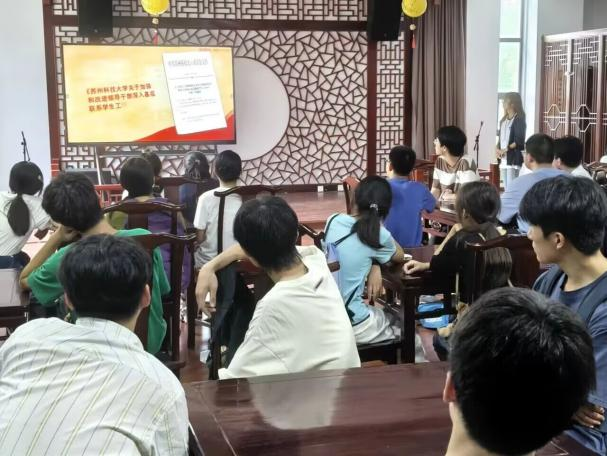 研学的核心站点聚焦于敬文书院。一踏入书院,墨香与书卷气便扑面而来,古雅静谧的环境与现代人文空间相得益彰,让同学们瞬间沉浸其中,在无声的氛围里体悟人文精神的深厚底蕴。为进一步搭建起中学与高校的沟通桥梁,书院特别安排了一场主题演讲。现场,学姐以饱含热情的演讲勉励在场学子珍惜当下宝贵的中学时光,以奋斗为笔、以坚持为墨,在学业道路上勇敢突破自我、勇攀高峰。分享尾声,学姐还向同学们发出诚挚邀请:“我们热忱欢迎各位报考苏州科技大学!”