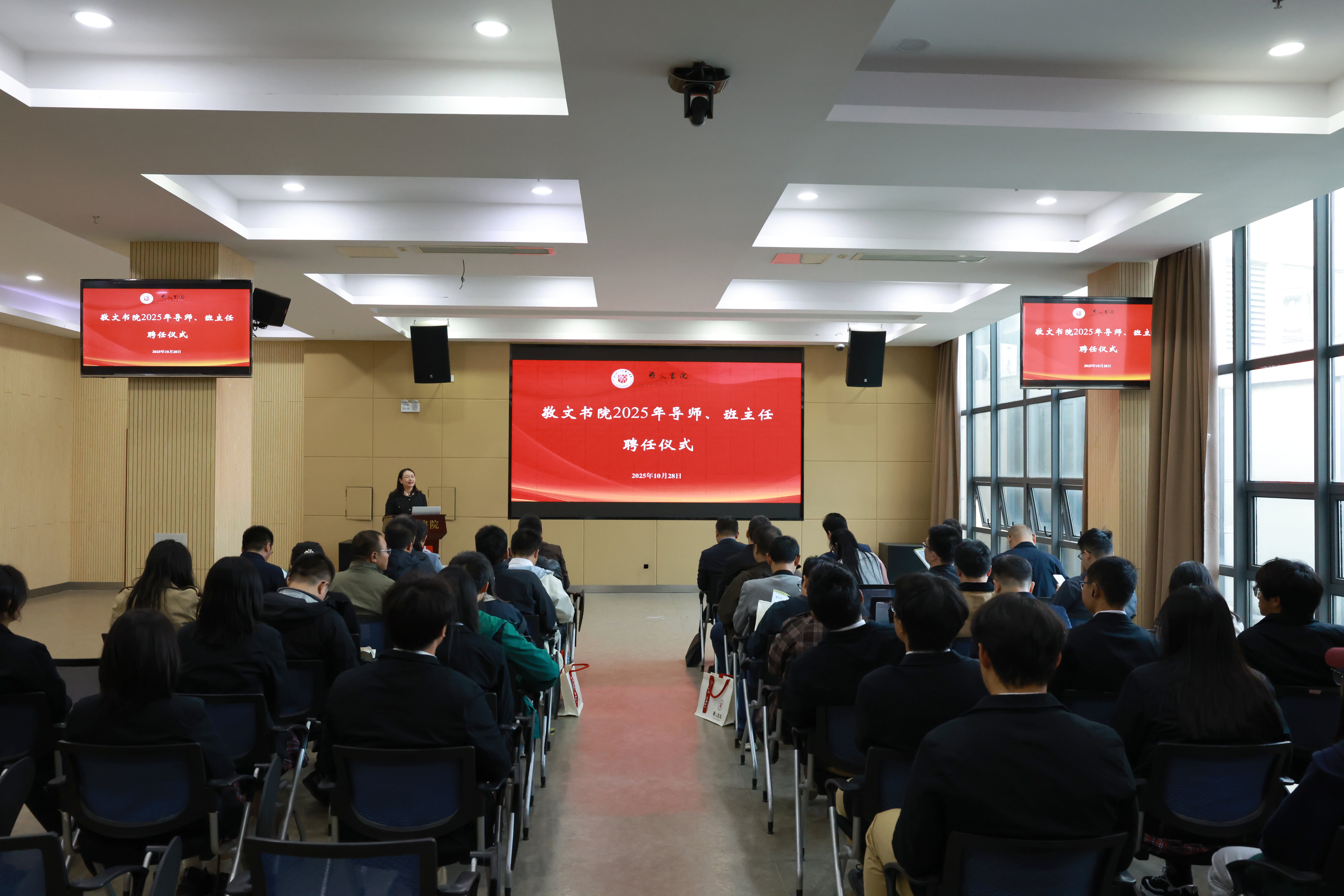 10月28日下午,敬文书院举行新学年学业项目导师、班主任聘任仪式。校党委常委、副校长崔雪丽出席仪式并讲话,敬文书院党总支书记兼院长张菡、受聘学业项目导师、新生班主任以及学生代表参加仪式,聘任仪式由敬文书院党总支副书记范晴岚主持。