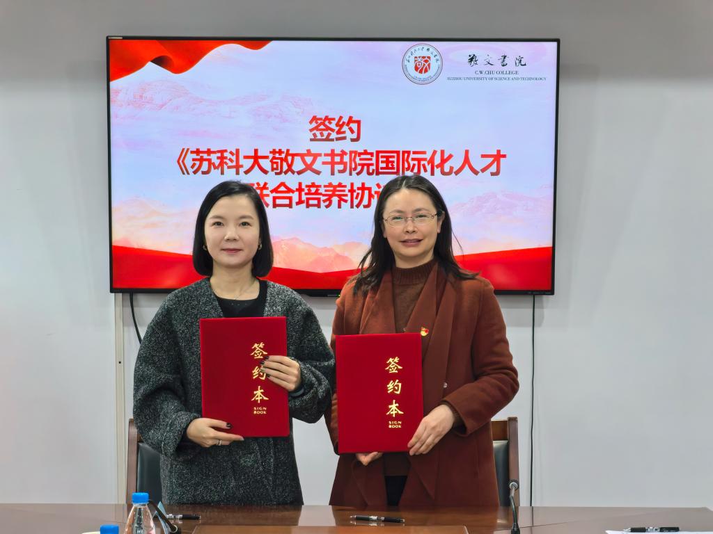 在与会嘉宾和师生代表的共同见证下,张菡与傅羽共同签约了《苏科大敬文书院国际化人才联合培养协议》并进行了“大学生生涯规划寒假训练营”开营揭牌仪式。