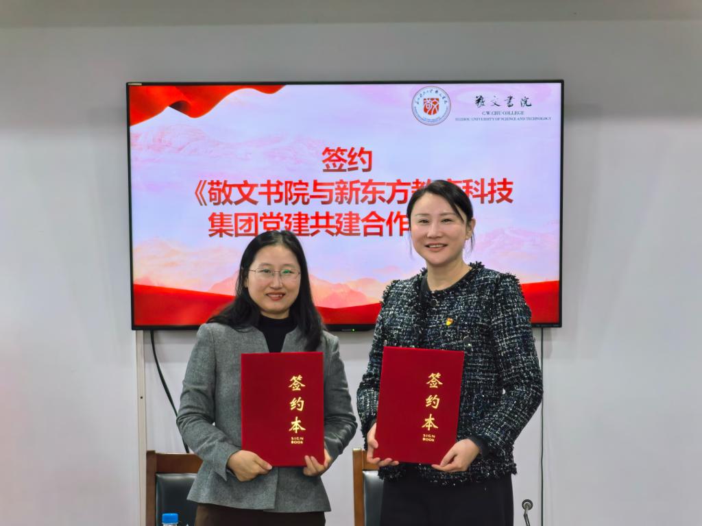 12月24日,敬文书院与新东方前途出国苏州公司隆重举行国际化人才联合培养签约仪式暨敬文书院“大学生生涯规划寒假训练营”开营仪式。苏州新东方学校党委书记、副校长汪静静、新东方前途出国苏州分公司总经理傅羽、新东方大学事业部苏州分校校长唐天宇、敬文书院党总支书记兼院长张菡、敬文书院党总支副书记范晴岚出席活动。