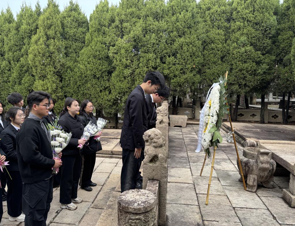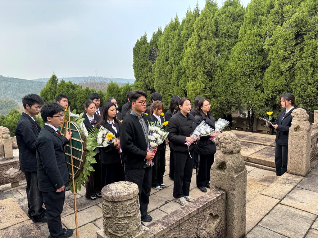 清明追思之际,书院2025级华若菡同学致哀悼词,全体师生敬献花圈与鲜花,以寄哀思。